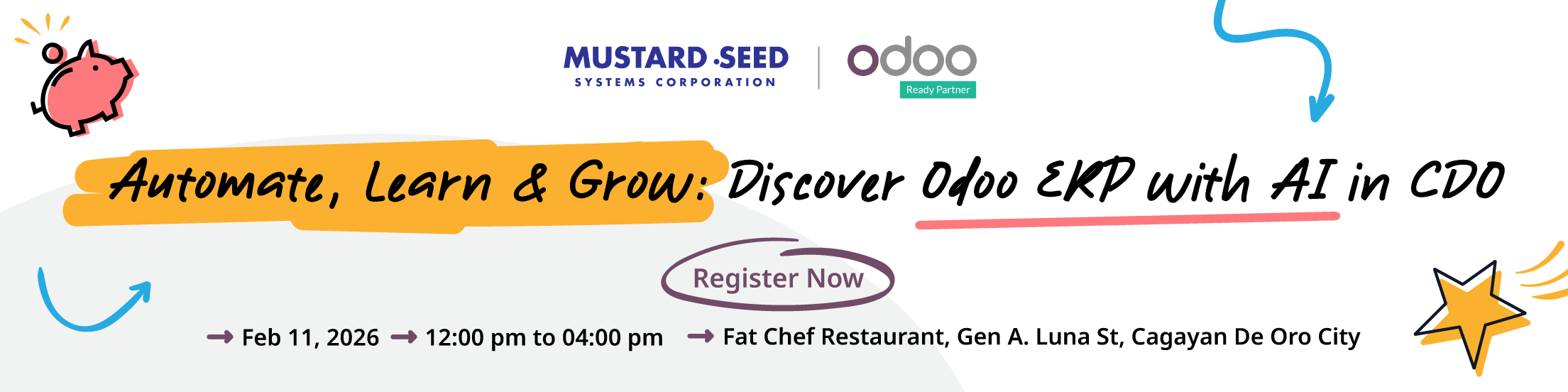 Organized and sponsored by Mustard Seed, this event will bring together business leaders and professionals to explore how Odoo ERP, enhanced with AI, can drive smarter, more agile business operations.